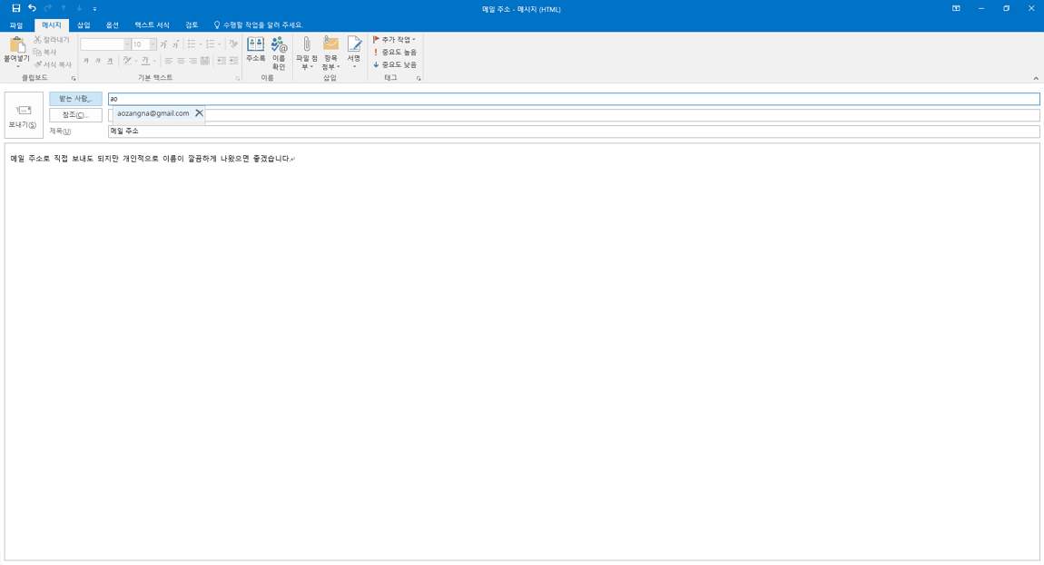 아웃룩 메일을 통해 한번 보냈거나 입력했었던 메일의 경우 아래 이미지와 같이 몇 글자만 쳐도 검색이 되어 편하긴 합니다만 이름이나 명칭으로 표시되면 더 깔끔해 보일 것 같았습니다.