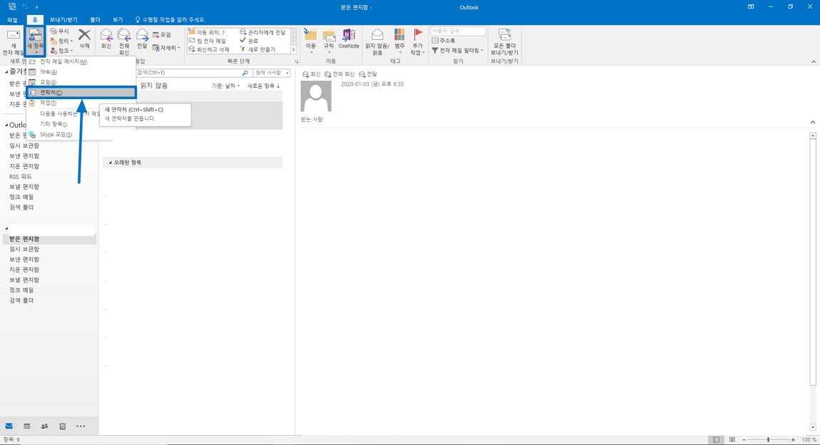제가 사용하는 아웃룩 버전이 2016 기준이긴 합니다만 버전별 사용 방법은 비슷할 테니 참고하시기 바랍니다. 아래 이미지와 같이 홈 메뉴 새 항목 연락처 메뉴를 선택해 주시면 됩니다.