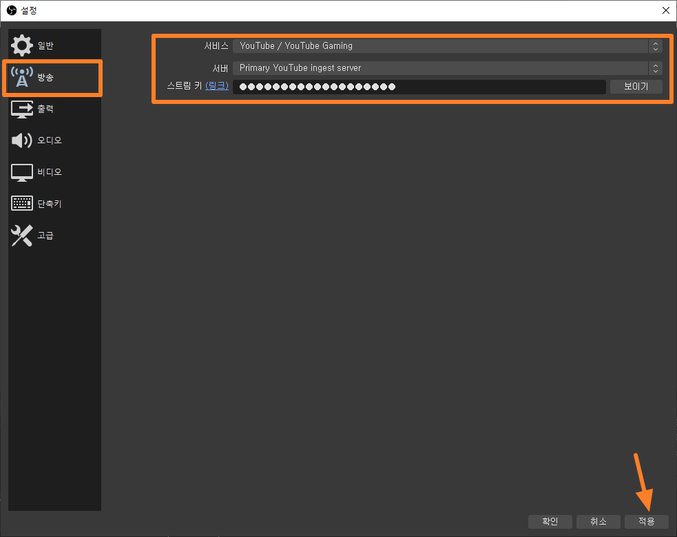 설정 메뉴에서 방송 메뉴를 선택하시고 서비스는 YouTube / YouTube Gaming 메뉴를 선택하시고 스트림 키는 아까 유튜브 라이브 스트리밍에서 발급받아 복사했던 글자를 붙여 넣어주시고 적용 버튼 눌러 주시면 됩니다.