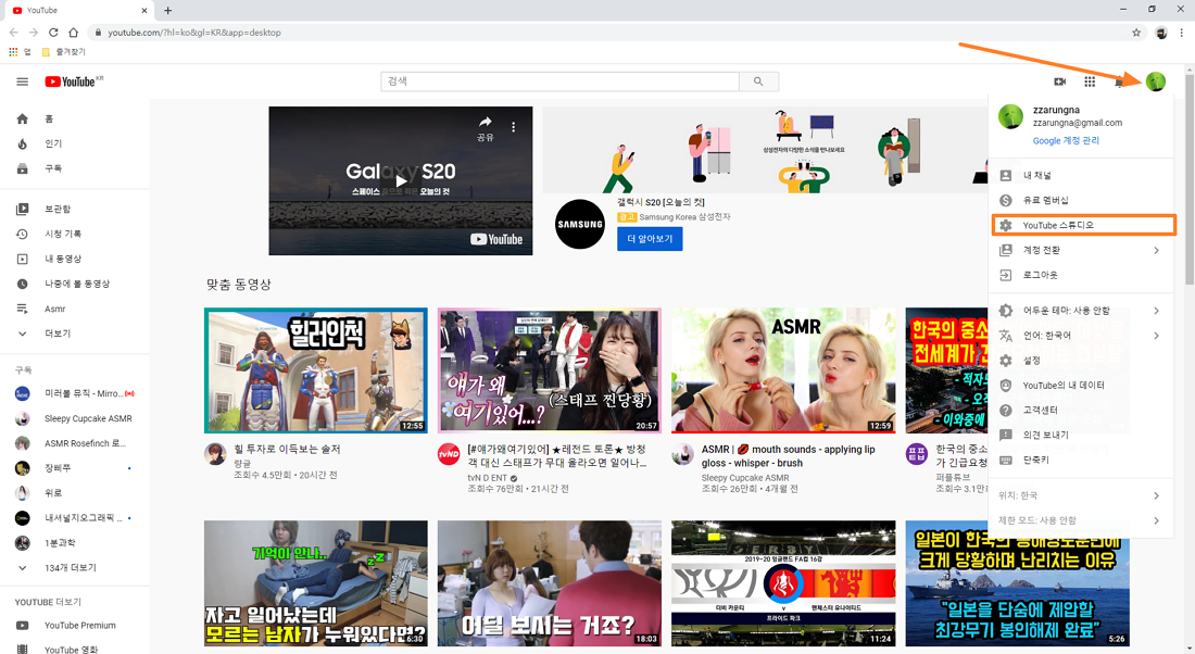 먼저 유튜브 사이트를(https://www.youtube.com/) 들어가시고 구글 계정으로 로그인하시면 됩니다. 로그인 후 아래 이미지와 같이 자신의 프로필 메뉴를 누르시면 추가 메뉴가 나오게 되며 YouTube 스튜디오 메뉴를 선택하시면 됩니다.