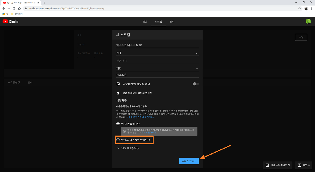 그럼 아래 이미지와 같이 새 스트림 화면이 나오게 되며 라이브 스트리밍 제목을 입력하시고 방송 카테고리를 선택 후 아니요. 아동용이 아닙니다. 를 선택해 주셔야 실시간 채팅이 가능하니 참고하시고 스트림 만들기 버튼을 눌러 주시면 됩니다.