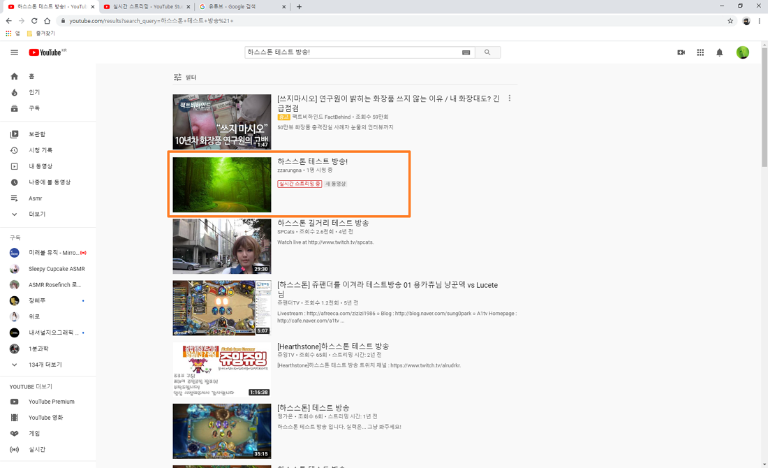 마지막으로 제가 방금 시작한 유튜브 실시간 스트리밍이 정상적으로 진행되고 있는지 확인해 보기 유튜브 사이트에서 제가 작성한 제목으로 검색해 보니 실시간 스트리밍 중 인 것을 확인할 수 있었습니다.
