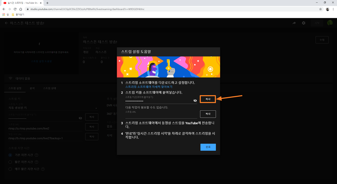 아래 이미지와 같이 유튜브 라이브 스트림 키를 발급받을 수 있으며 복사 버튼을 눌러 생성된 스트림 키를 복사해 놓으시면 됩니다.