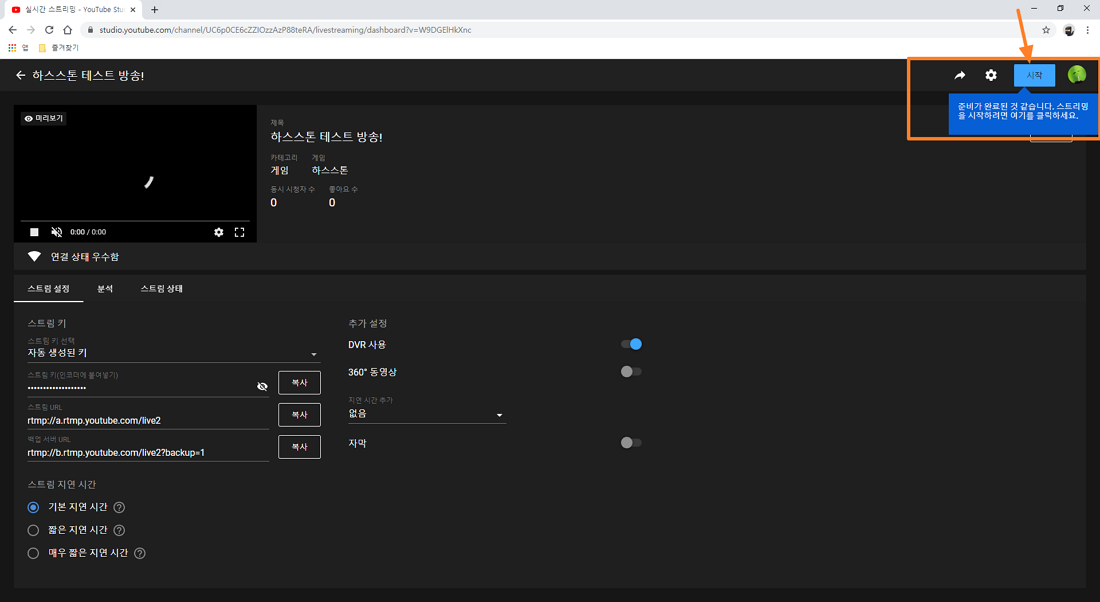 다시 유튜브 라이브 스트리밍 웹 페이지를 보시면 아래 이미지와 같이 준비가 완료된 것 같습니다. 스트리밍을 시작하려면 여기를 클릭하세요 라고 나옵니다. 시작 버튼 눌러 주시면 됩니다.