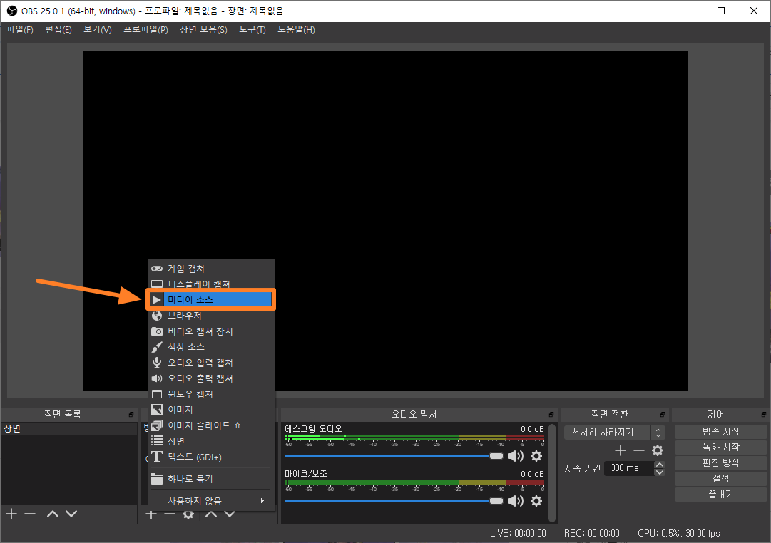 그럼 여러 가지 화면을 캡처할 수 있는 메뉴가 나오게 되는데 여기서 미디어 소스를 선택해 주시면 됩니다.