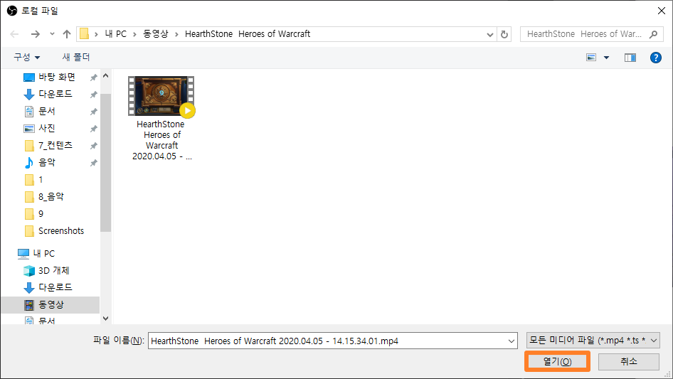 PC에 있는 파일 중 동영상 관련 파일을 선택하시고 열기 버튼을 눌러 주시면 됩니다.