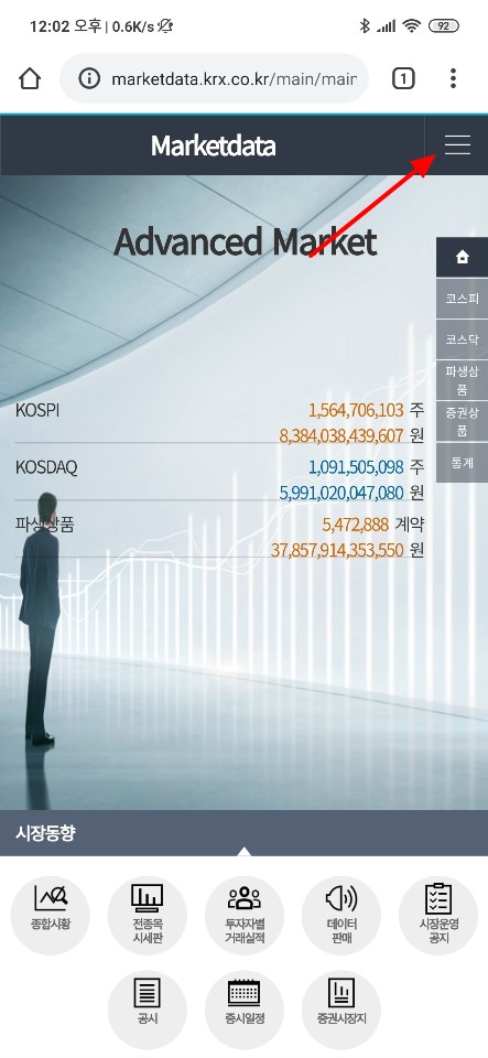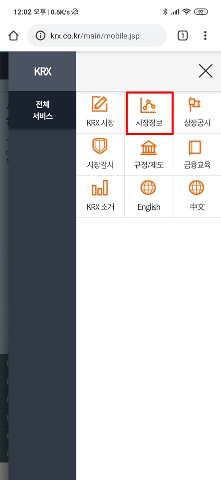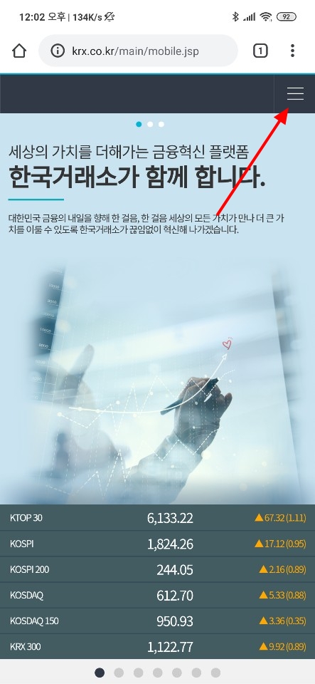 상단에 정리한 글을 링크를 통해 바로 확인이 가능하지만 사이트에 메인 페이지에서 메뉴를 통해 접근도 가능합니다. 먼저 모바일 환경에서 http://www.krx.co.kr/main/mobile.jsp 링크를 타고 들어가서 메뉴 버튼을 눌러 주시면 됩니다.