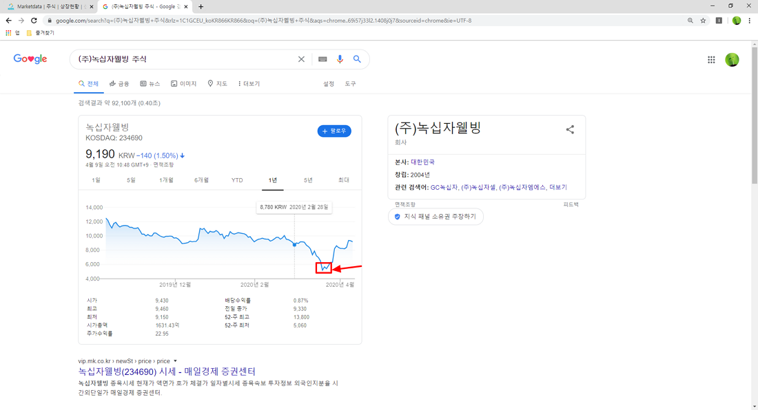 상장한 기업 중 하나를 골라 현재 주식 시세가 얼마나 되는지 알아보았습니다.