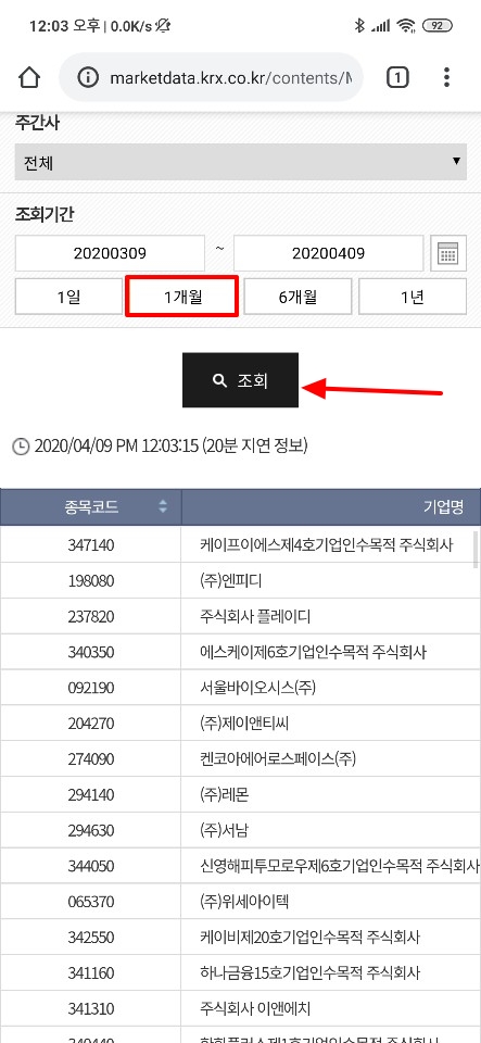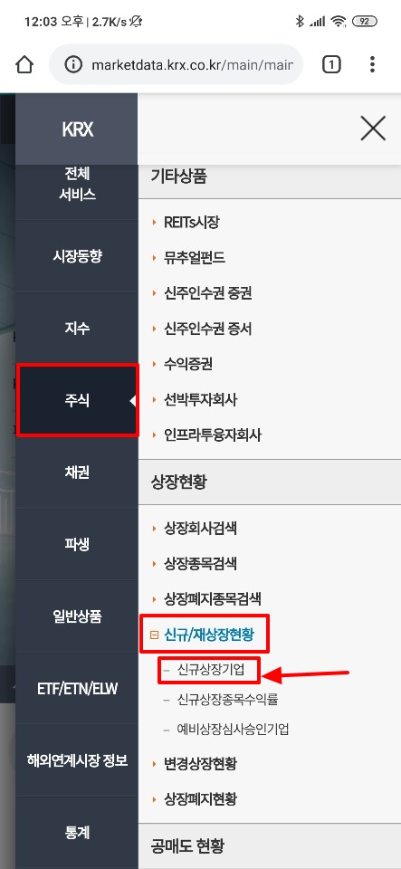 모바일 버전 한국거래소 사이트를 통한 신규 상장 기업 리스트 확인 방법
