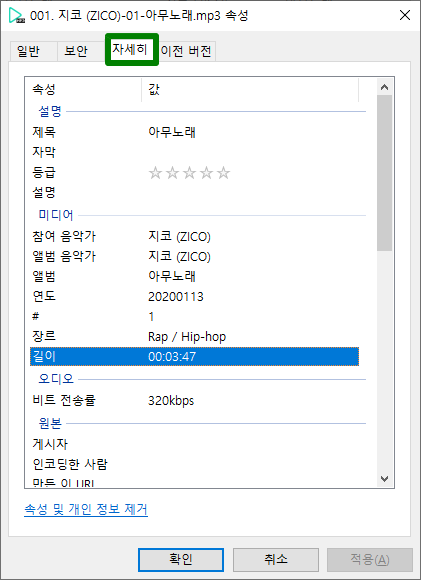 아래 이미지와 같이 자세히 탭에서 해당 영상 또는 음악 파일의 길이를 확인하실 수 있습니다.