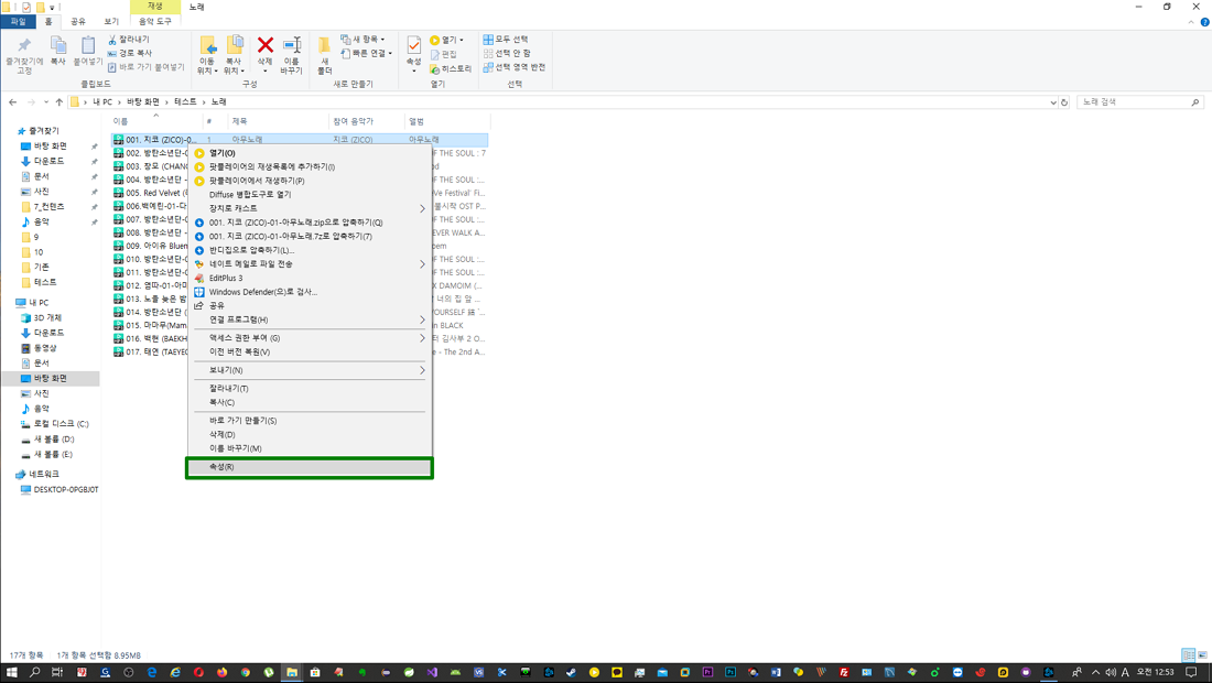윈도우 환경에서 동영상 파일이나 음악 파일의 경우 해당 파일의 길이를 기준으로도 파일을 정렬할 수 있습니다. 아래 이미지와 같이 파일을 선택 후 마우스 오른쪽 버튼을 눌러 파일의 속성을 확인해 보시면 해당 파일의 길이는 얼마나 되는지 확인이 가능합니다.