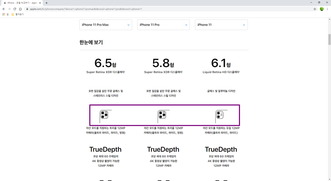 좀 더 아래로 페이지를 내려가 보시면 아이폰 카메라 3개, 3개, 2개 그리고 추가 스펙들은 어떻게 되는지 선택한 아이폰 시리즈별로 비교 가능합니다.