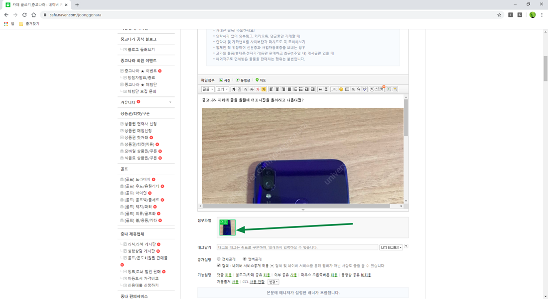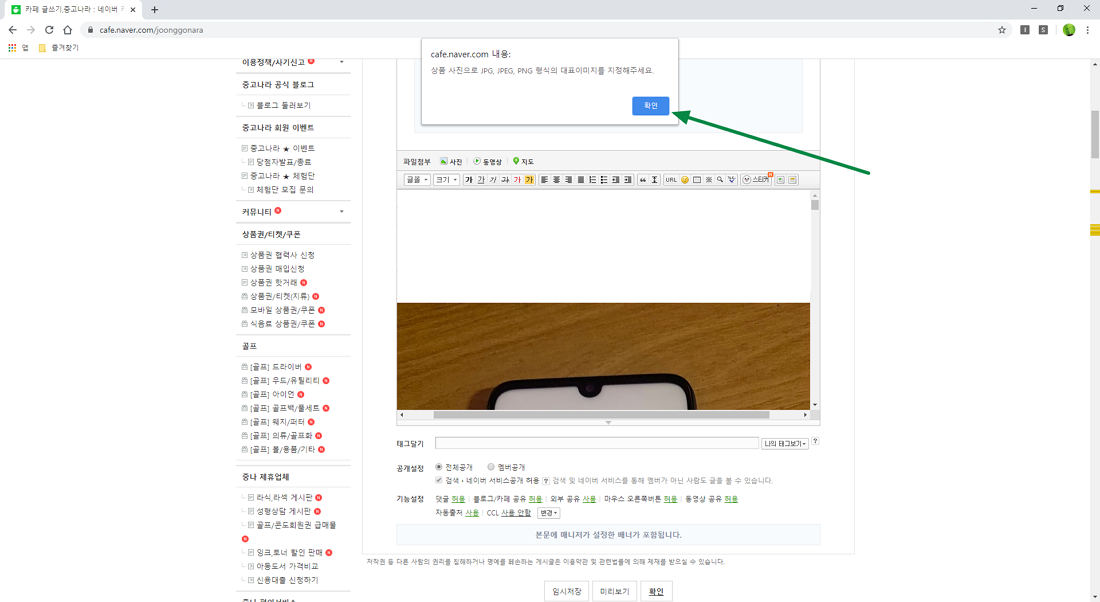 네이버 중고나라 글 등록 시 대표 이미지를 지정해 주세요. 해결 방법