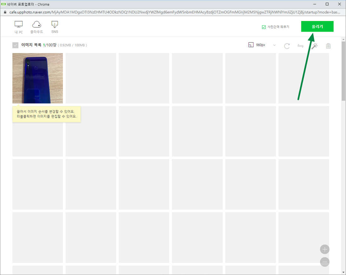 아래 이미지와 같이 사진이 업로드된 것을 확인할 수 있으며 올리기 버튼을 눌러 주시면 됩니다.