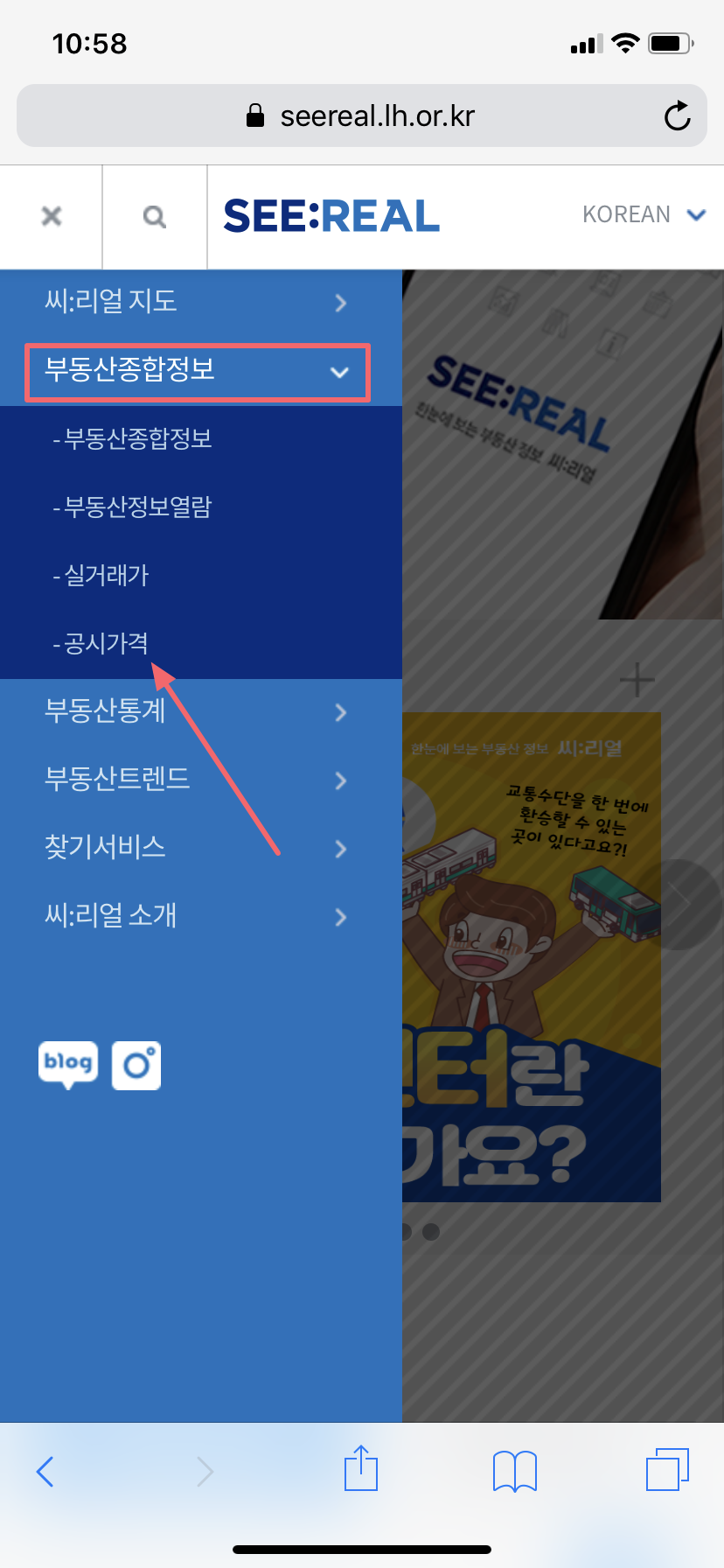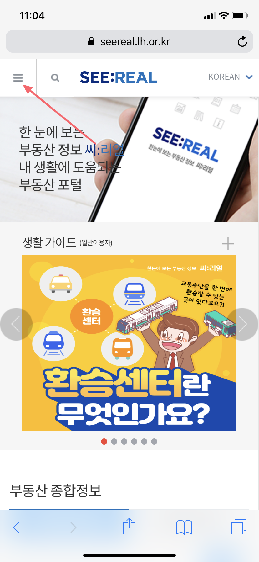 앱도 있지만, 개인적으로 인터넷 조회로 간단히 조회 가능하니 굳이 앱은 설치하지 않았습니다. 사이트 URL을 참고하셔서 https://seereal.lh.or.kr/ 사이트에 접속하시고 아래 이미지와 화살표 방향에 표시된 메뉴 버튼을 눌러 주시면 됩니다.