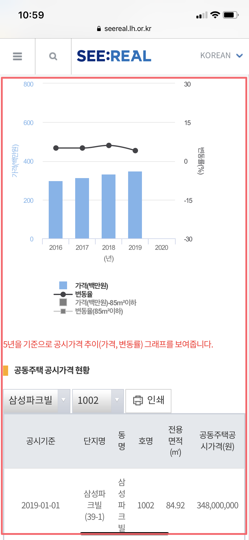 그럼 아래 이미지와 같이 공동주택공시가격이 얼마로 책정되어 있는지 간단히 확인하실 수 있으며 연도별로 그래프 형태로 통계도 보실 수 있습니다.