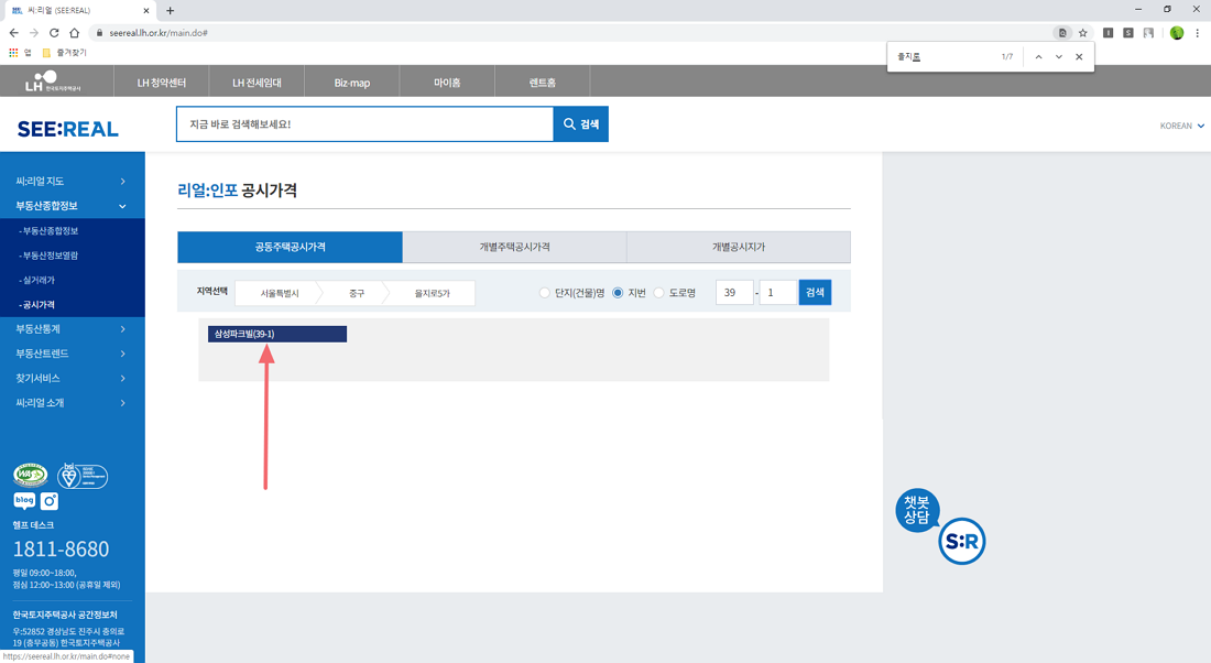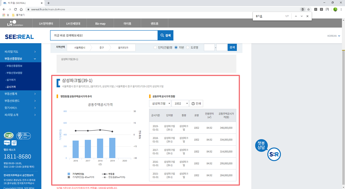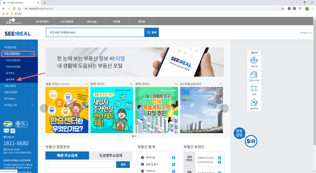 PC/컴퓨터 환경에서 https://seereal.lh.or.kr/ 사이트에 접속하시고 왼쪽에 부동산종합정보 메뉴를 누르시고 공시가격 메뉴를 누르시면 됩니다.