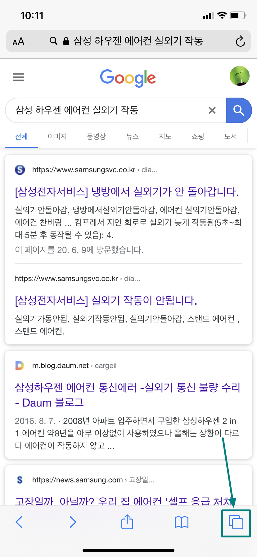 아이폰에 사파리 앱을 실행한 뒤 아래 이미지와 같이 열려있는 웹 페이지 목록을 확인하기 위해서는 화살표 방향에 표시된 버튼을 눌러 주시면 됩니다.