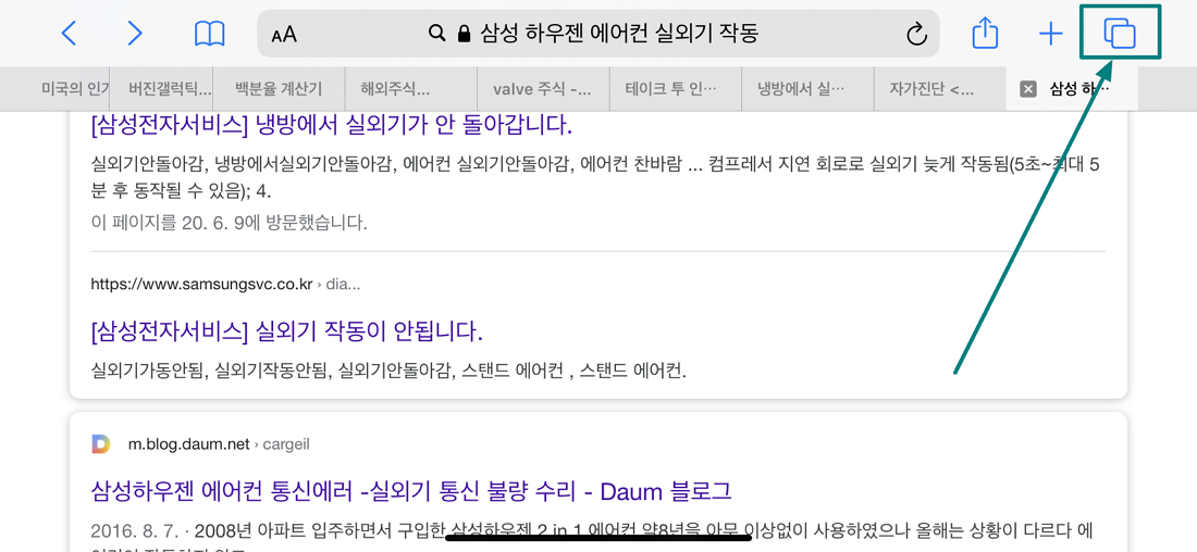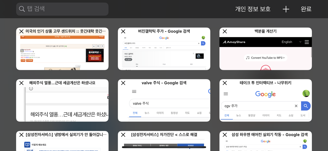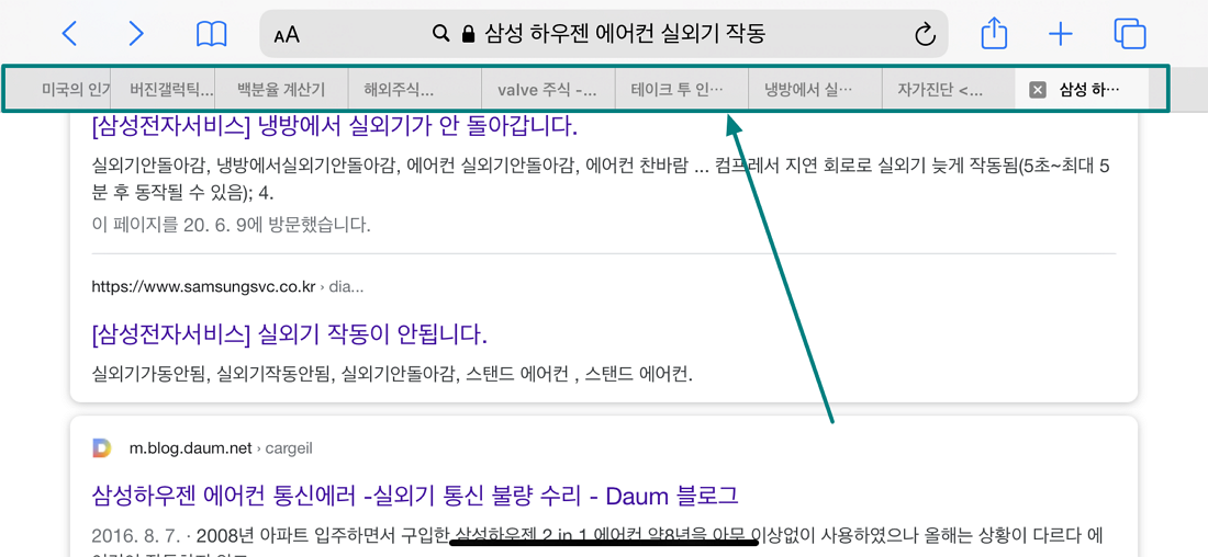 그럼 사파리 브라우저를 통해 기존에 열려있는 인터넷 페이지 목록들을 확인할 수 있으며 드래그하며 이용했던 웹페이지를 다시 선택할 수 있습니다만 개인적으로 이러한 탭 방식은 저에게 익숙하지 않아서 그런지 불편했습니다.