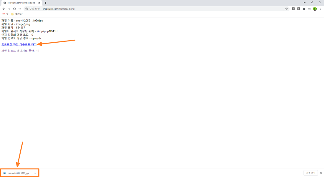 html a태그를 사용해 웹서버에 위치한 파일의 경로와 이름만 GET 방식의 쿼리스트링으로 fileDownload.php 위치에 넘겨주면 방금 올렸던 파일을 다운로드 할 수 있습니다.