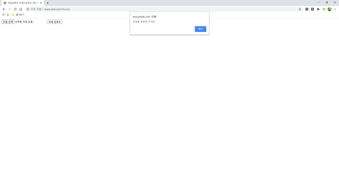 위 소스를 적용한 UI 화면이며 파일 첨부를 하지 않고 파일 업로드 버튼을 눌렀을 때 아래 이미지와 같이 파일 전송이 되지 않습니다.