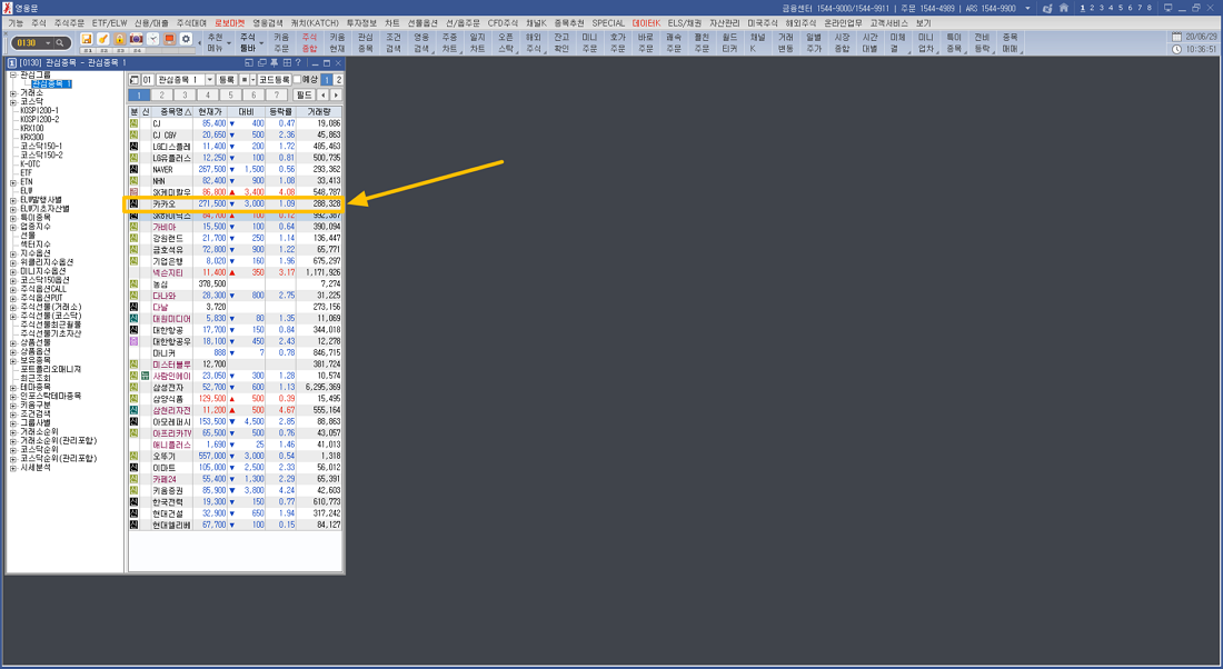 그럼 관심종목 영역에 방금 등록한 카카오 주식회사가 등록된 걸 확인할 수 있습니다.