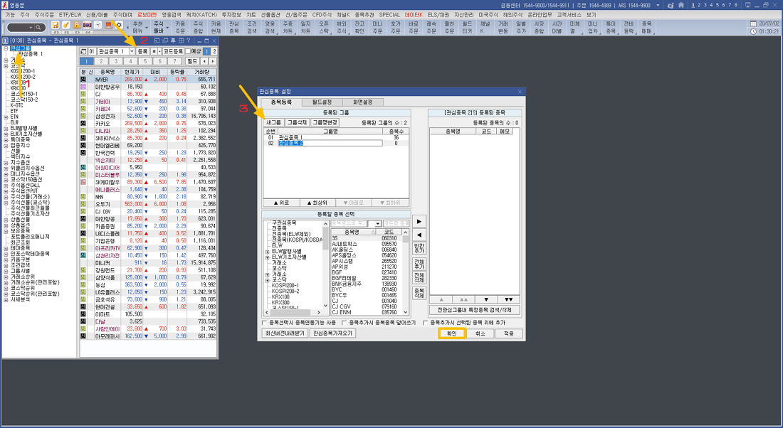 그럼 기존에 제가 추가했던 주식 회사의 관심 목록이 나오게 되는데 최초 즐겨찾기를 등록하시려면 관심 그룹을 등록해야 합니다. 번호 순서대로 관심그룹 선택 → 등록 버튼 → 관심그룹에 새 그룹 버튼을 눌러 이름을 지정하고 확인 버튼을 누르시면 됩니다.