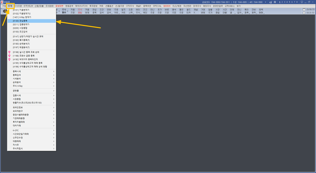PC 화면에서 영웅문 프로그램을 실행한 화면입니다. 다른 창은 복잡하니 모두 종료하였습니다. 프로그램 상단 메뉴에서 주식 → 관심종목 메뉴를 선택하시면 됩니다.