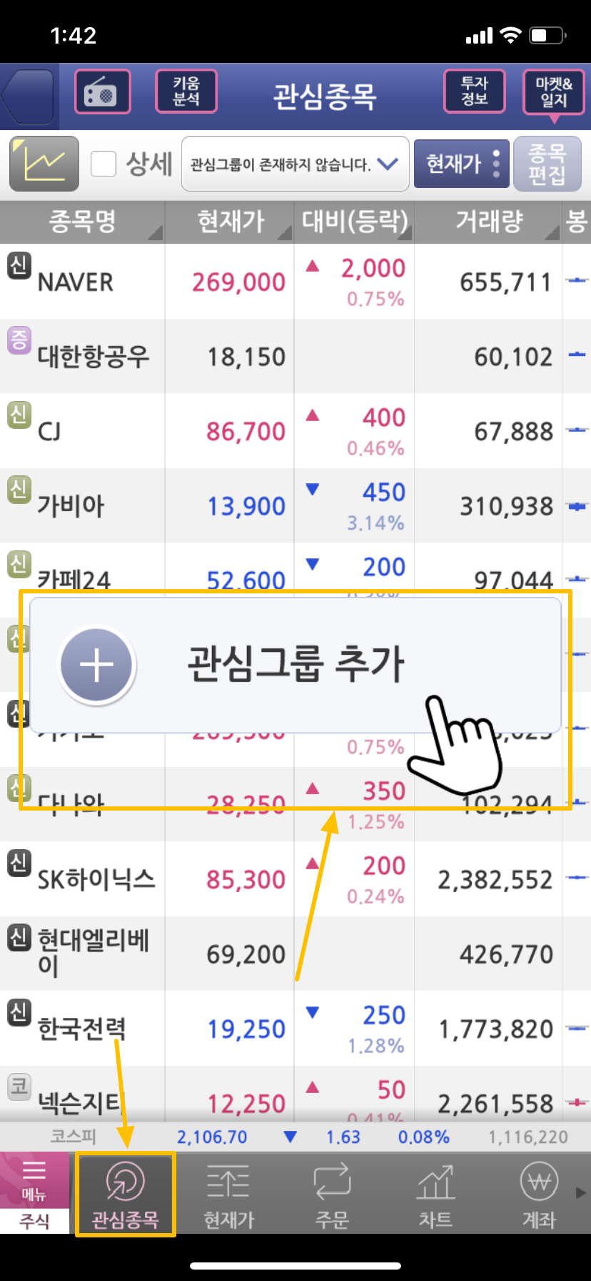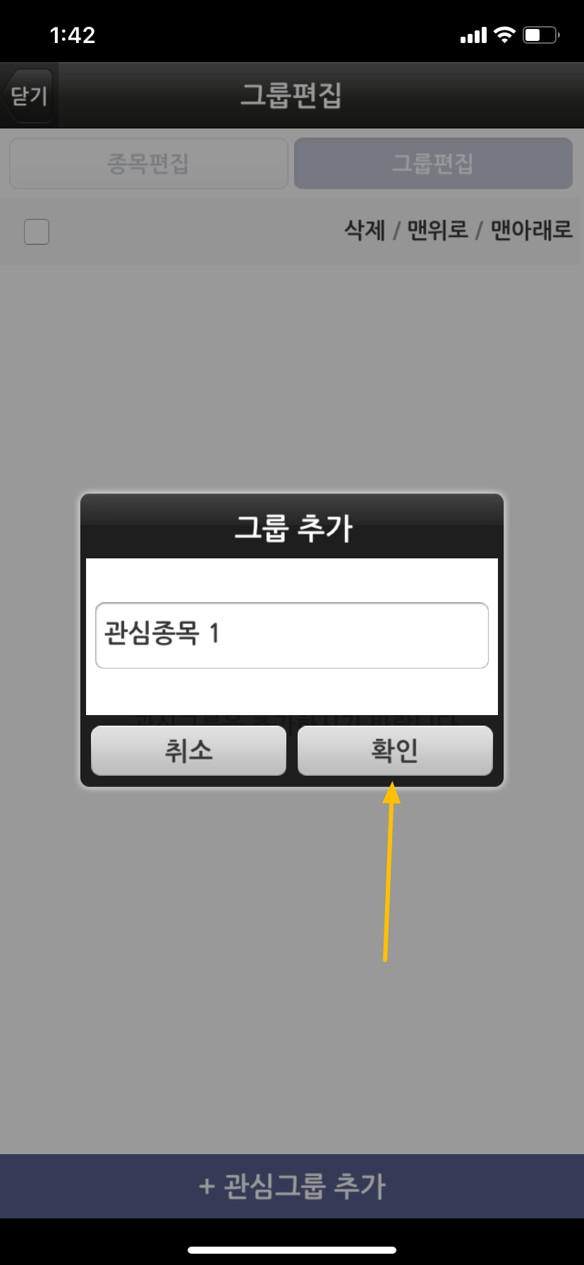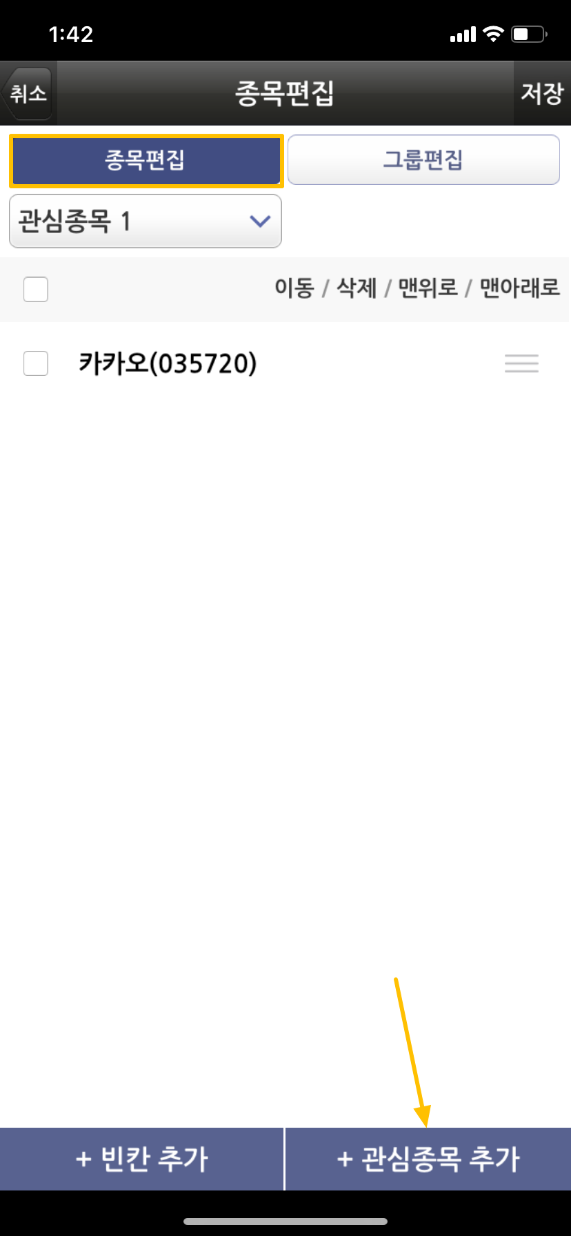 기존에 저는 PC에서 그룹을 이미 등록하였고 기존에 종목들도 등록되어 있어 그룹을 등록하지 않았습니다. 그룹이 등록되어 있지 않으신 분은 상단 오른쪽에 그룹편집 메뉴를 통해 그룹을 먼저 생성해 주시면 됩니다.