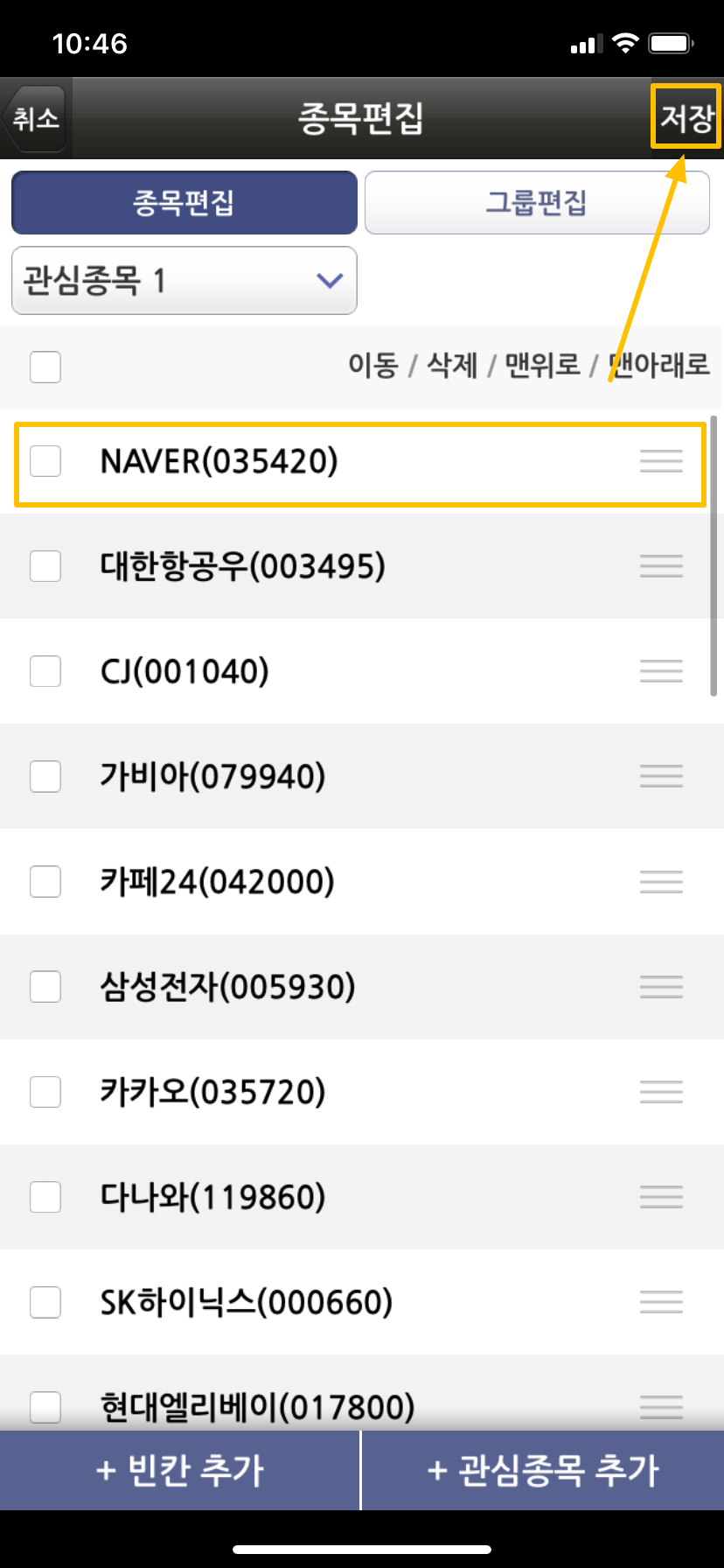 이런 식으로 원하는 종목들을 모두 등록하셨으면 상단 오른쪽 메뉴에 저장 메뉴를 눌러 주시면 됩니다.