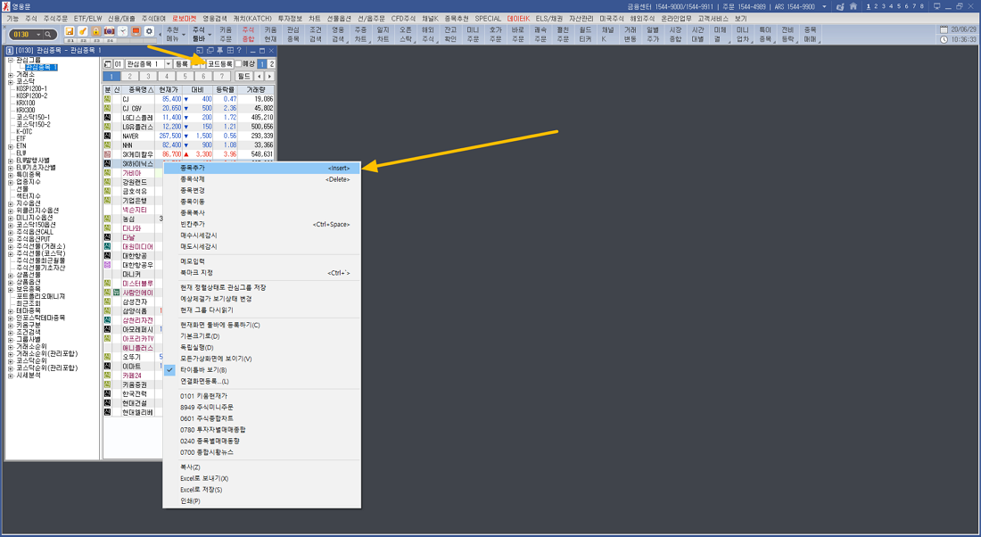 관심그룹을 등록 후 열려 있는 오른쪽 영역에 마우스 오른쪽 버튼을 누르시면 종목을 추가 할 수 있습니다. 종목 삭제의 경우는 삭제할 관심종목을 선택하시고 종목 삭제를 누르시면 됩니다.