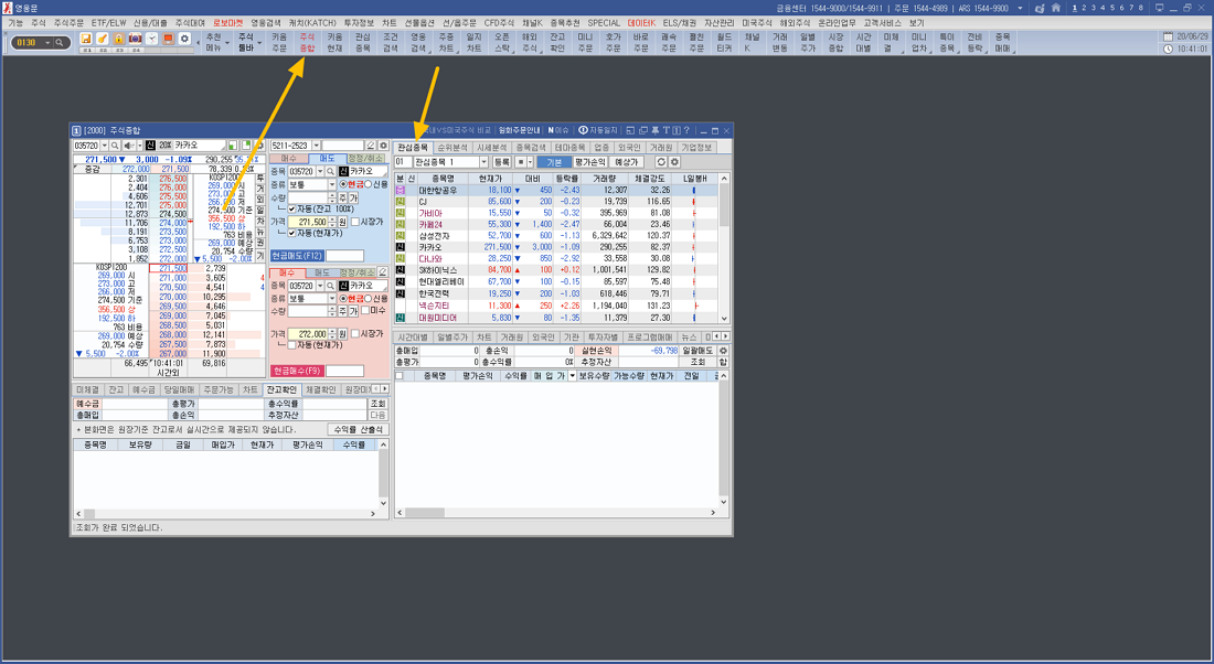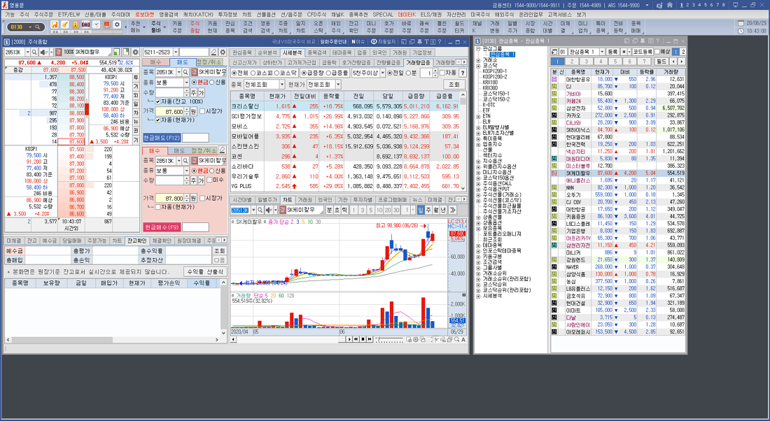 프로그램 상단에 주식 종합 메뉴를 통해 주식을 매수, 매도하며 오른쪽 영역에 관심 종목 메뉴를 한눈에 볼 수 있으니 이것도 참고하시면 좋을 듯합니다.