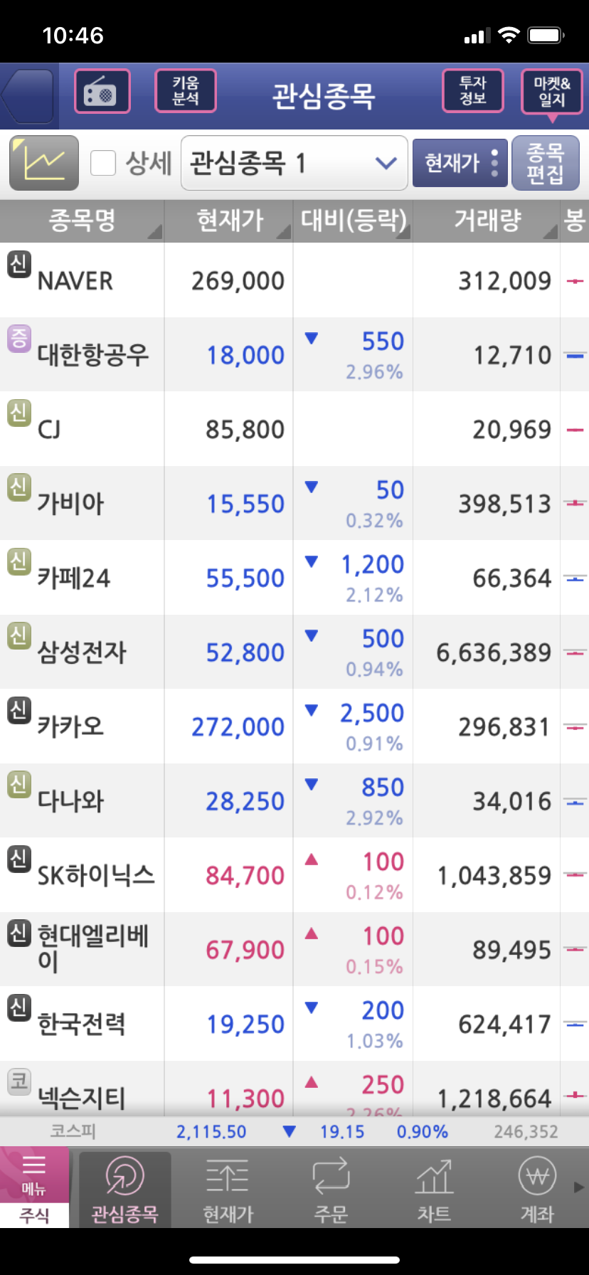 그럼 관심종목 영역에 방금 등록한 카카오 주식회사가 등록된 걸 확인할 수 있습니다.