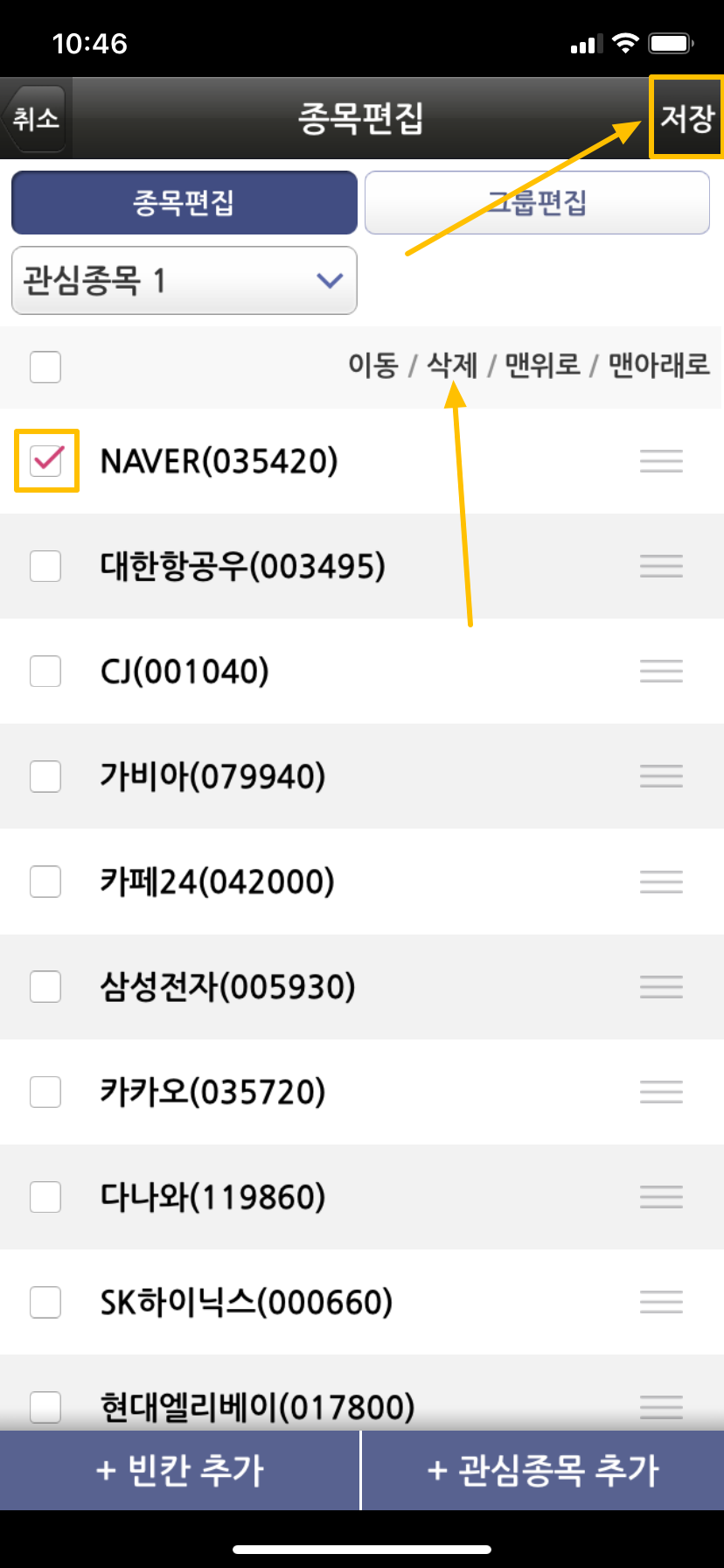즐겨찾기한 종목을 삭제하고 싶으시면 다시 관심종목 → 종목편집 메뉴로 들어가시고 삭제할 주식회사를 체크 표시하시고 삭제 버튼을 눌러 주시면 됩니다. 마찬가지로 작업이 끝나면 저장 버튼을 눌러 주시면 됩니다.