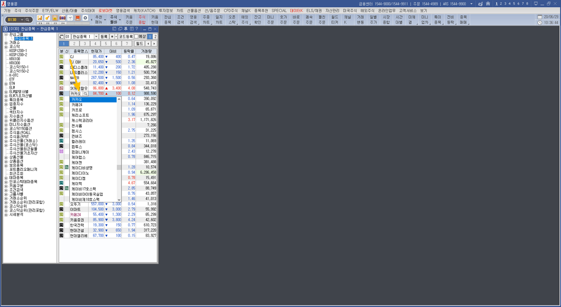 아니면 아래 이미지와 같이 주식종합창에 시세분석 메뉴를 열어 놓고 오른쪽 화면엔 관심 종목 영역을 배치해도 좋을 듯하네요.