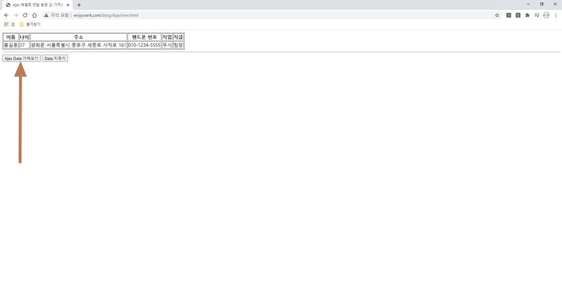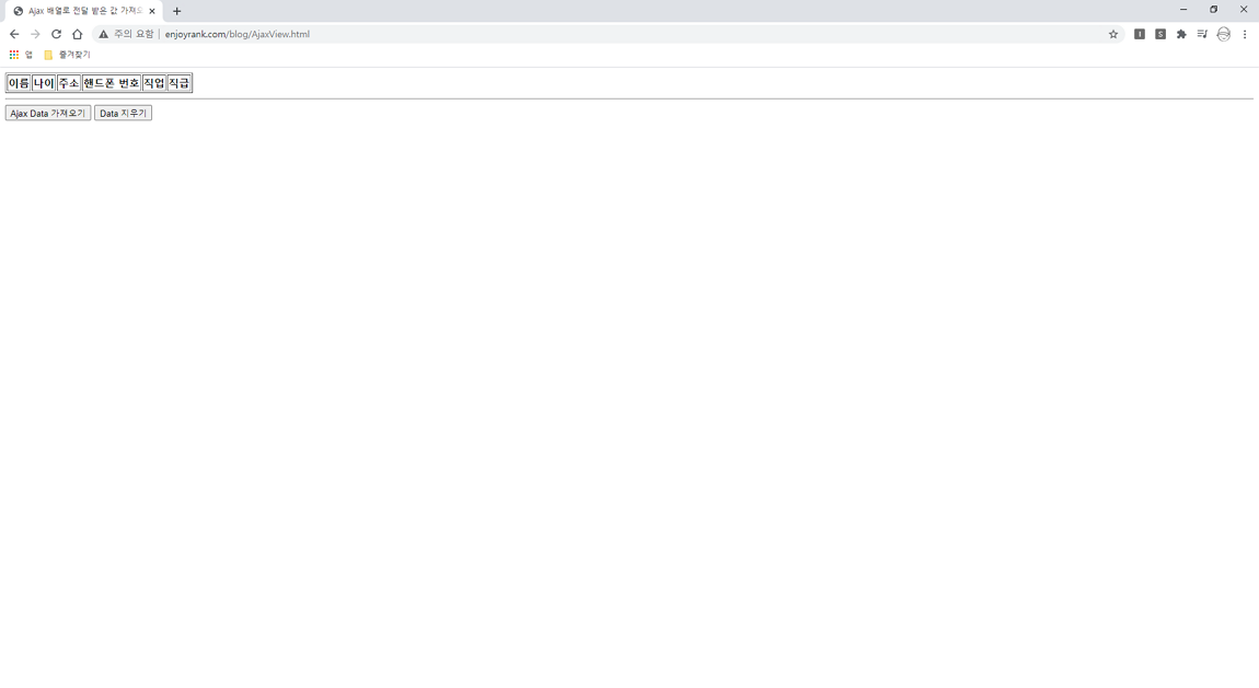 위 소스를 작성 후 HTML 페이지를 브라우저에서 열어보면 아래 이미지와 같은 형태로 나오게 됩니다. 간단히 Ajax Data 가져오기 버튼을 누르면 테이블 태그에 데이터 내용을 채워 주는 형태입니다.
