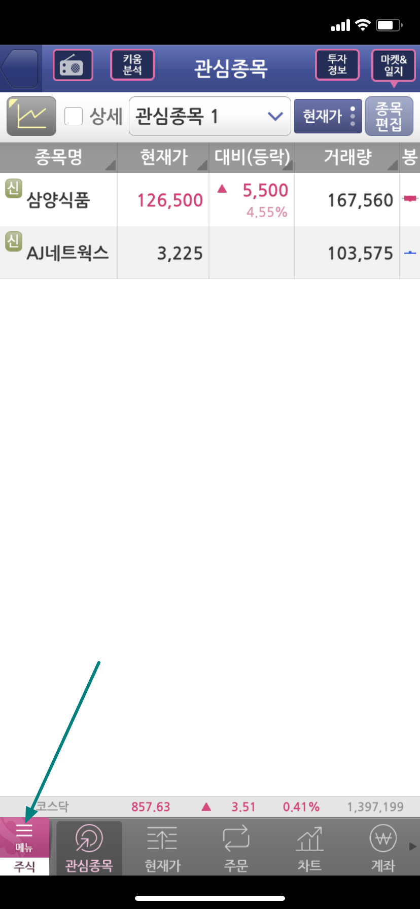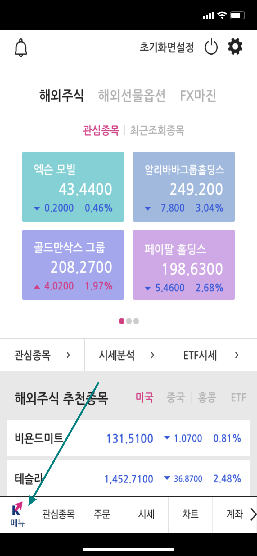 국내 주식 매매를 주로 하시는 분들은 영웅문s 앱을 이용해 전체 자산을 확인할 수 있습니다. 하단 왼쪽에 있는 메뉴 버튼을 눌러 주시면 됩니다.
