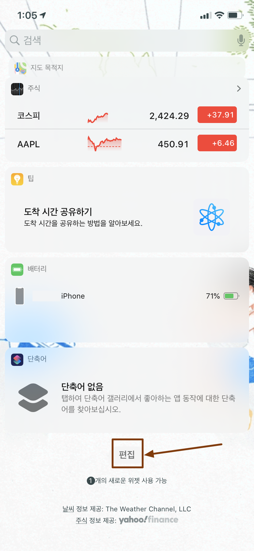 아이폰 위젯에 딱히 손댄 적은 없으나 몇 가지 기본적으로 제공하는 위젯들이 보입니다. 하단 부분에 편집 버튼을 눌러 사용하지 않는 위젯은 삭제하고 쓸만한 위젯이 어떤 것들이 있는지 확인해 보고자 합니다.