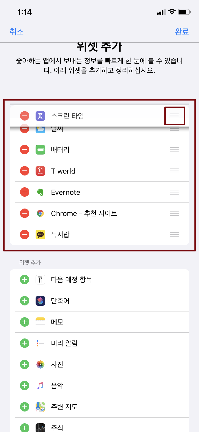 추가로 화면상에 표시된 위젯의 순서를 변경하시려면 갈색 네모에 표시된 버튼을 누른 상태로 위아래로 옮기시면 화면에 표시되는 위젯의 순서도 변경 가능합니다.