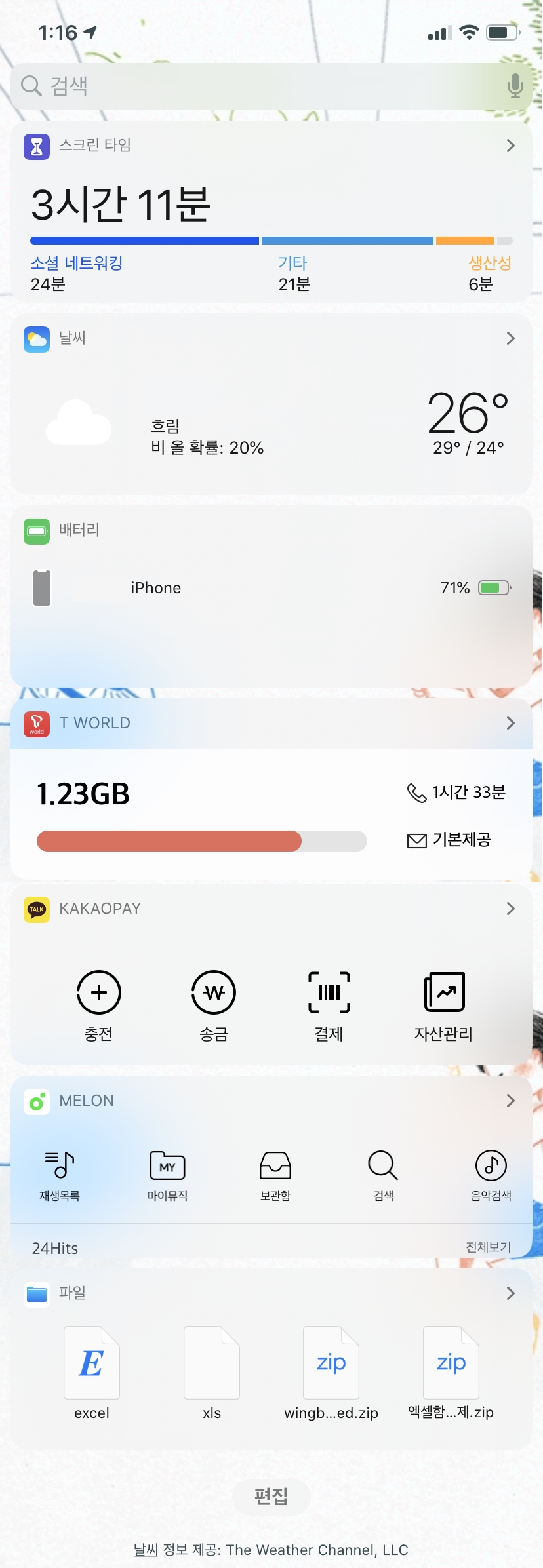 몇 가지 쓸만한 위젯을 찾아보았는데, 스크린 타임, 날씨, 배터리 T WORLD, KAKAOPAY, MELON, 파일 위젯이 꽤 쓸만해 보였습니다.