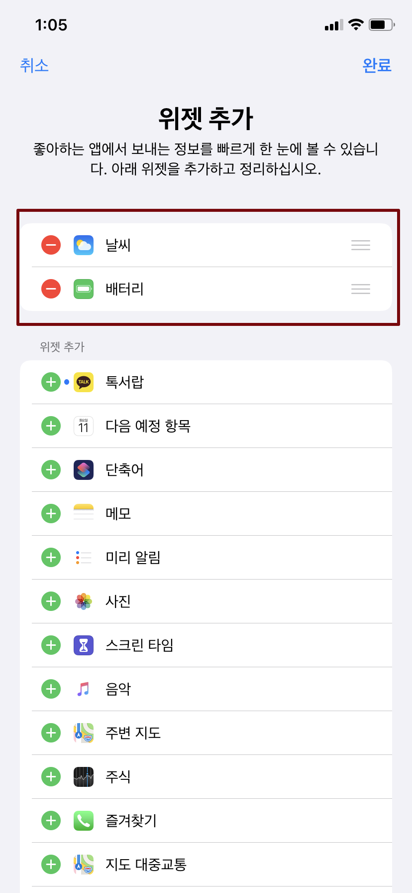 몇 가지 위젯을 써보았는데 쓸만한 위젯 두 개만 남기고 오른쪽 위에 완료 버튼을 눌러 보았습니다.