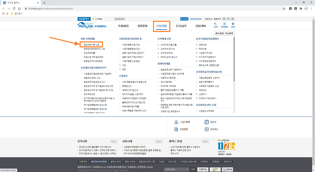 근로장려금 ㆍ자녀장려금을 직접 방문하여 수령하는 방식이 아닌 인터넷을 통해 계좌를 신청해 해당 계좌로 입금 받고 싶으시다면 아래 이미지와 같이 신청/제출 메뉴에 일반세무서류 신청 메뉴를 선택하시면 됩니다.