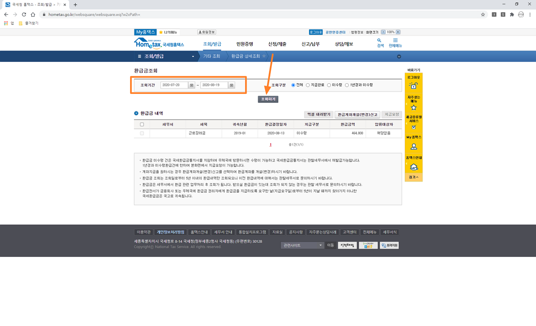 이곳에서 조회 기간을 지정하시고 조회하기 버튼을 누르시면 환급금 액수의 얼마나 되는지 처리되는 사항은 어떻게 되는지 확인 가능합니다.