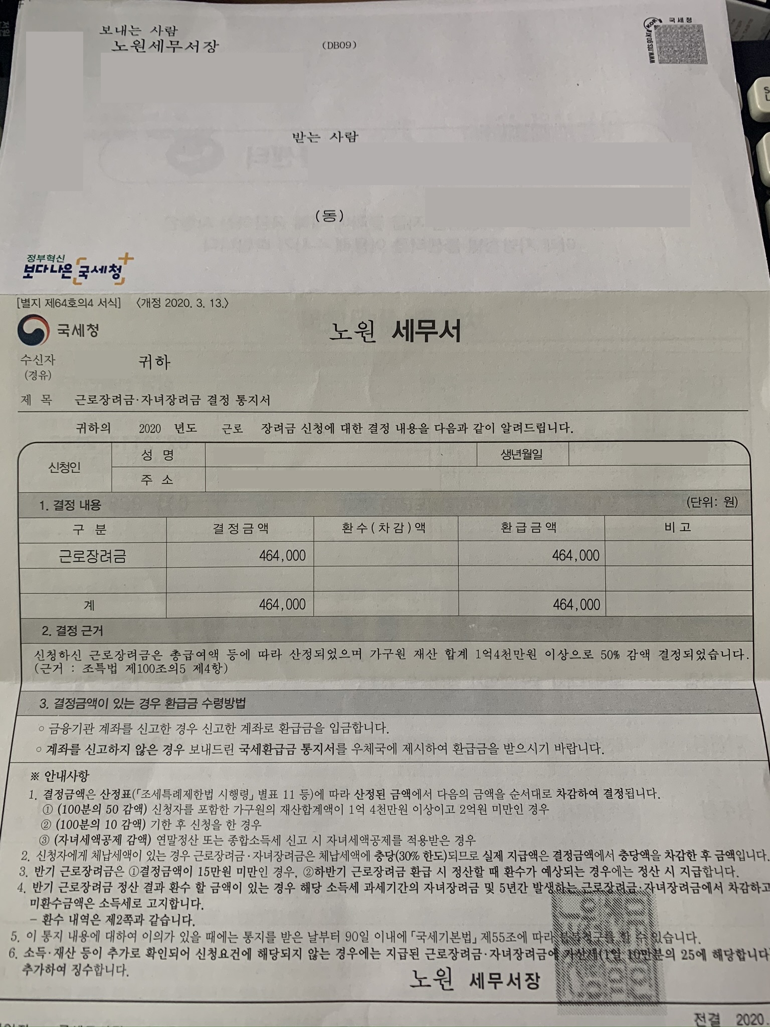 이전에 근로장려금 환급금 신청을 신청하였고 최근에 국세 환급금 통지 서류를 받았습니다. 약 40만 원의 금액을 환급받을 수 있었으며 해당 서류를 가지고 우체국에 방문하면 현금으로 받을 수 있다고 되어 있었습니다.
