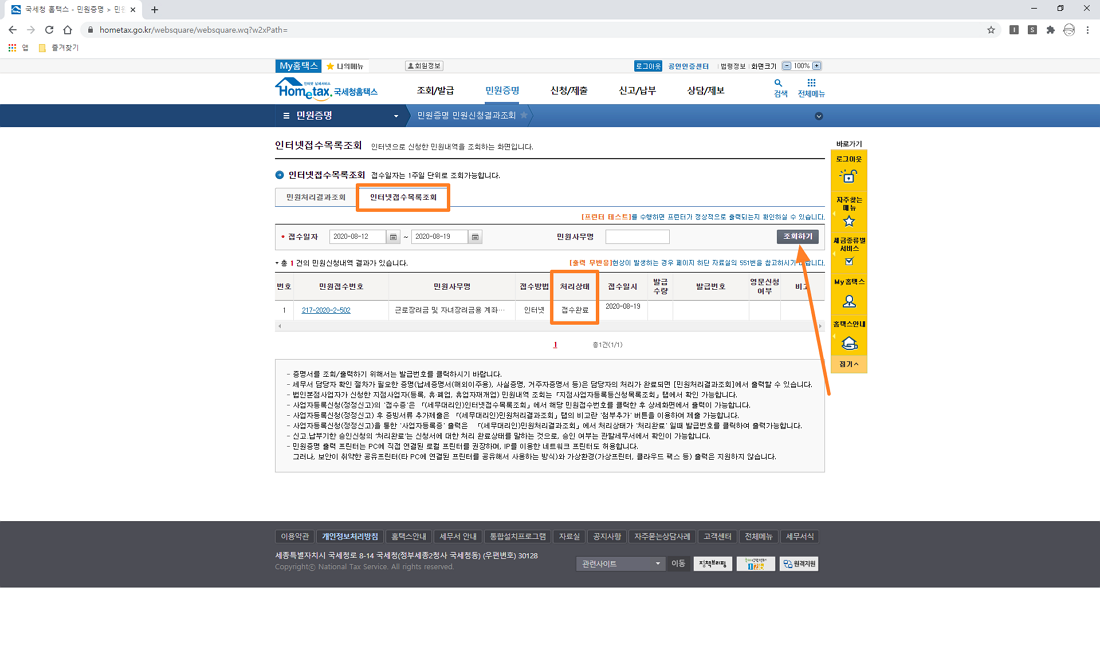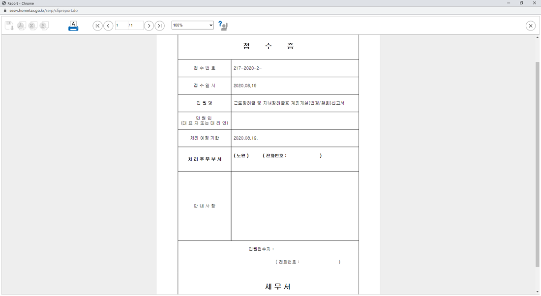 신청이 완료되면 아래 이미지와 같이 접수증 정보가 나옵니다.