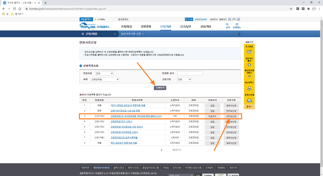 메뉴를 선택 후 조회하기 메뉴를 누르시면 아래 이미지와 같이 리스트 항목들이 나오는데 근로장려금 및 자녀장려금용 계좌개설 신고서 항목에 오른쪽에 있는 인터넷 신청 메뉴를 선택하시면 됩니다.
