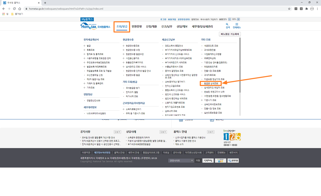 작성한 기준은 PC 인터넷 환경으로 작성하였으니 참고하시면 좋을 것 같습니다. 먼저 근로장려금 ㆍ 자녀 장려금 환급 내용을 조회하시려면 국세청 홈텍스 사이트에 접속 후 www.hometax.go.kr 로그인을 하시고 상단에 조회/발급 메뉴 → 환급금 상세조회 메뉴를 선택하시면 됩니다.