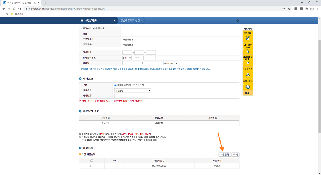 이곳에서 근로장려금 ㆍ자녀장려금 환급금으로 받을 계좌를 입력하시면 됩니다. 계좌 정보 항목에 입금 받으실 계좌에 대한 정보를 선택하고 입력하시고 첨부 서류 메뉴에서 통장 사본을 찍은 파일을 첨부하시면 됩니다.