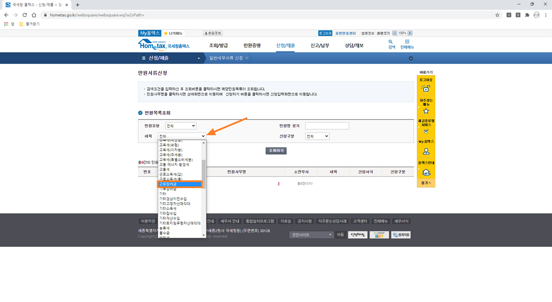 세목 메뉴에서 근로장려금 또는 자녀 장려금을 선택하시면 됩니다. 가나다순으로 정렬되어 있으니 확인하시고 저는 근로 장려금을 선택 후 진행하였습니다.