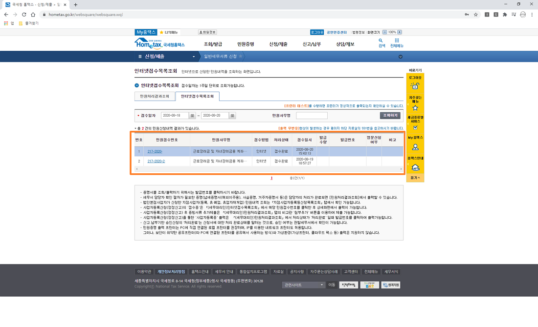신청이 완료되면 아래 이미지와 같이 접수증 정보가 나옵니다.